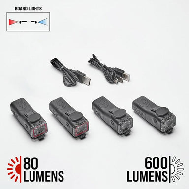Illuminate your ride with compact, strong, and long-lasting 600 lumen headlights and 80 lumen rear lights designed specifically for electric skate...